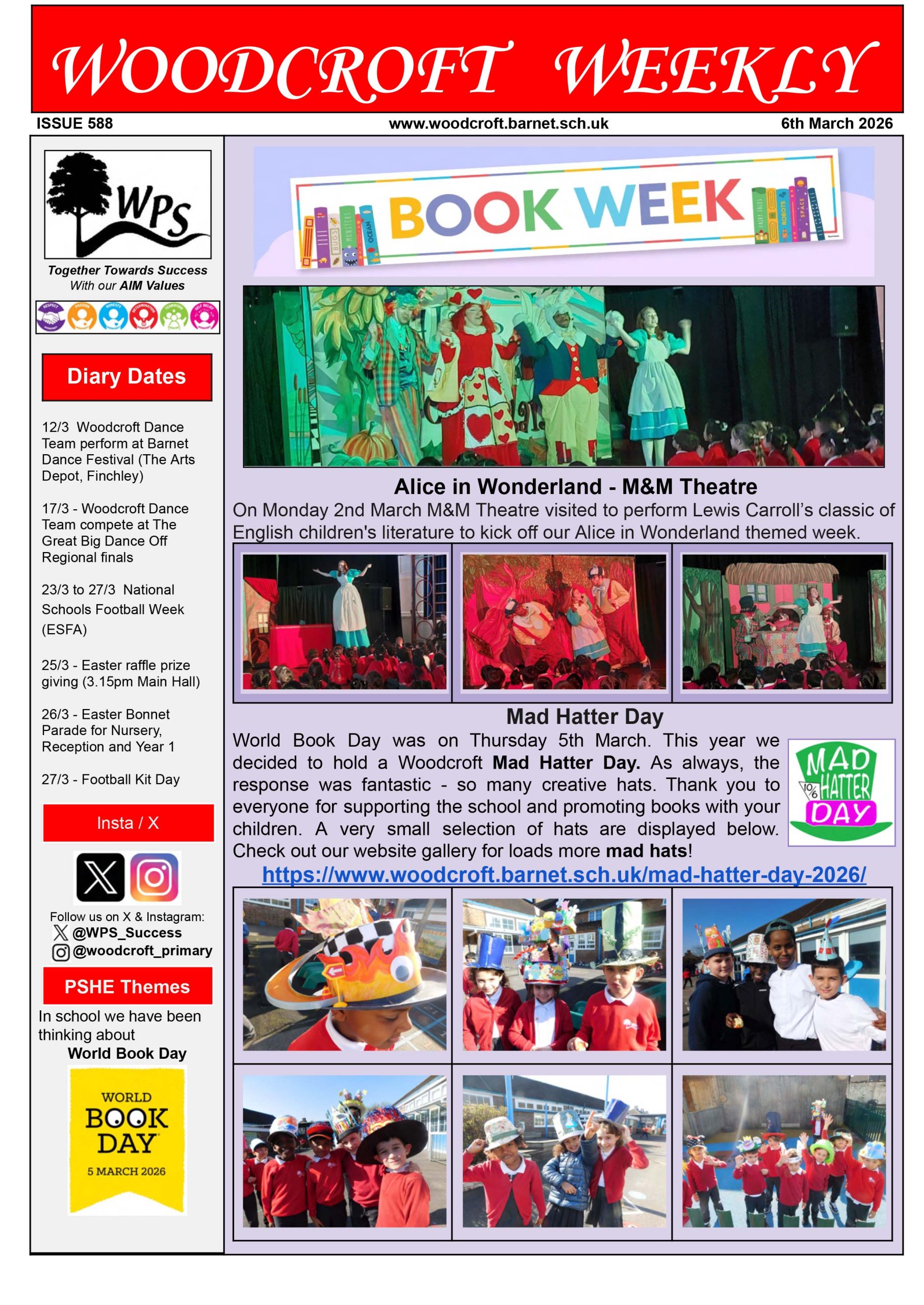The week was our Alice in Wonderland themed Book Week. We have enjoyed theatre groups, mad hat days, assemblies, quizzes and challenges! All of this, and lots more, can be found in Woodcroft Weekly ISSUE 588