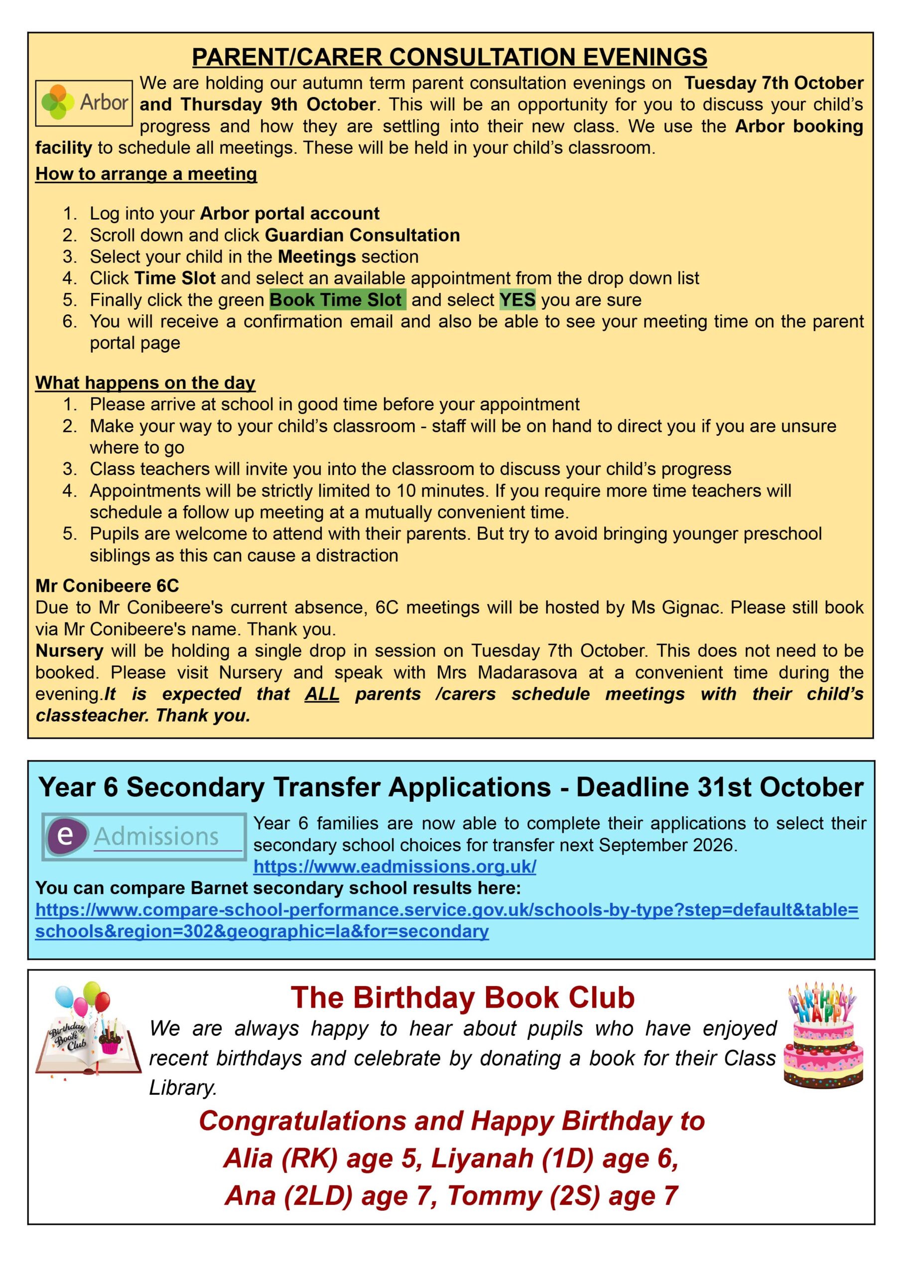 Finally, if you haven’t booked already, make sure you use the Arbor App to select a time to meet with your teacher next week. Full instructions are reprinted on page 3.